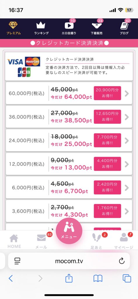 モコムの報酬は「ポイント制」で、ユーザー(男性)が利用したポイントの一部が女性キャストに還元される形です。チャット・通話・画像送信など、利用形態ごとに単価が設定されています。