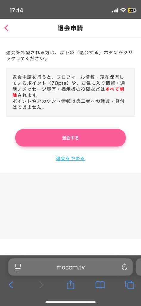 モコムの退会(アカウント削除)は非常に簡単です。数ステップで完了し、面倒な引き止めや手続きは一切ありません。